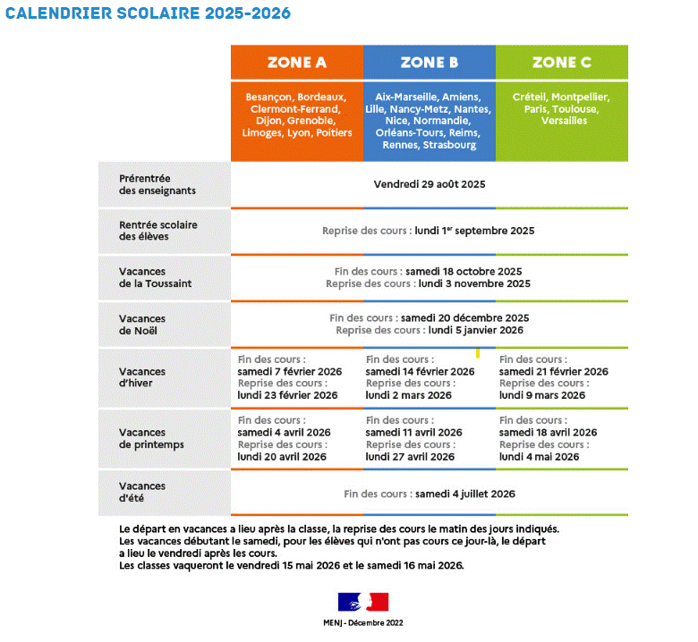 Pour plus d’informations, cliquez ici : https://www.education.gouv.fr/calendrier-scolaire-100148